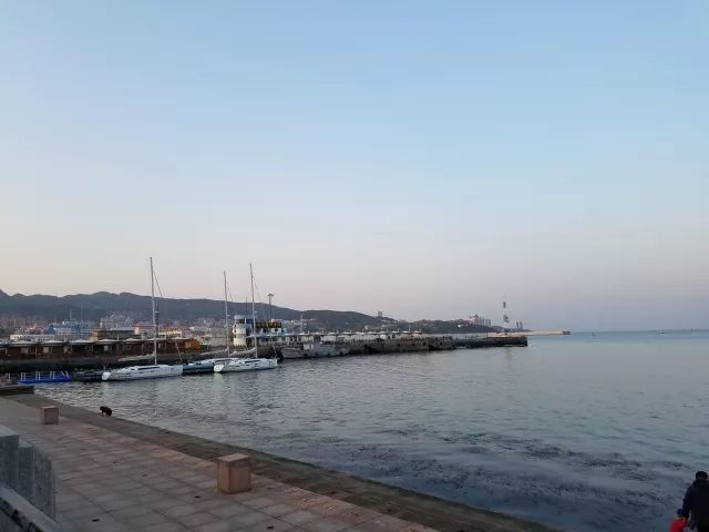 一路上走走停停,随着暮色渐起,在海港公园倚栏观海,临近黄昏下的海面,蔚蓝而又壮阔,波光粼粼的水面上,几艘游船静静停泊港口,岸边亦有散步闲坐的游人和闲适的垂钓者。