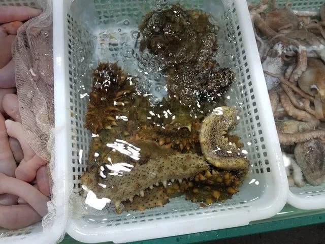 大市场里的海参也是非常的诱人,威海的海参属于刺参,由于威海沿岸海水清澈,礁石众多,海藻密布,这里的海参个体硕大,肉质肥美,突棘粗大,是刺参中的极品。在威海,海参的主流做法是捞拌海参、海参汤、海参粥等。