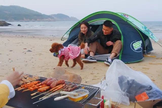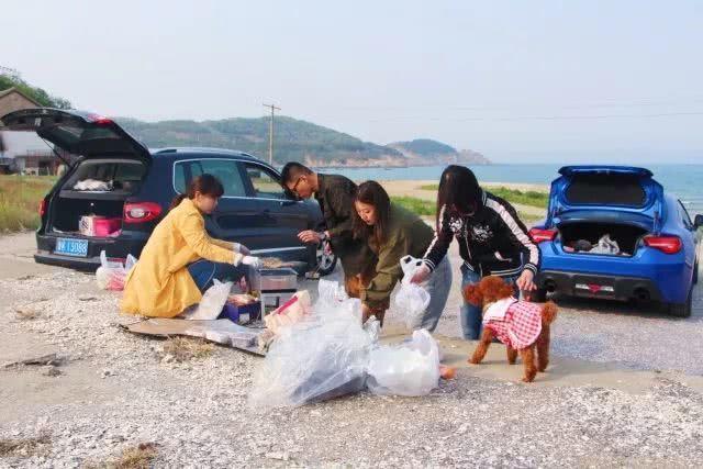 女生们负责整理食材,男生则负责硬件搭建,穿着花裙子的小泰迪负责四处卖萌。海边烧烤也是我们几个老同学每次相聚必备的一个项目。