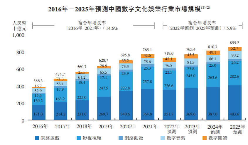 随着中国文化行业迅速发展及中国用户对文化娱乐的需求增长,中国数字文化娱乐市场(包括网络游戏、影视视频、网络动漫、数字音乐、数字阅读等细分市场)的规模由2016年的3863亿元增加至2021年的7651亿元,复合年增长率为14.6%。预期2023年至2025年,中国数字文化娱乐行业的市场规模将继续增加。而数字阅读的市场规模由2016年的167亿元增加至2021年的416亿元。