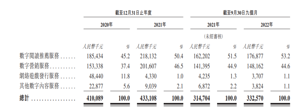 2020年-2022年9月30日(下称“报告期”),宜搜科技的收益分别为4.1亿元、4.33亿元、3.33亿元;同期年内溢利分别为3130.5万元、5001.1万元及3000万元。其中,数字阅读推荐服务在总营收中的占比分别为45.2%、50.4%和53.2%,是主要收入来源。