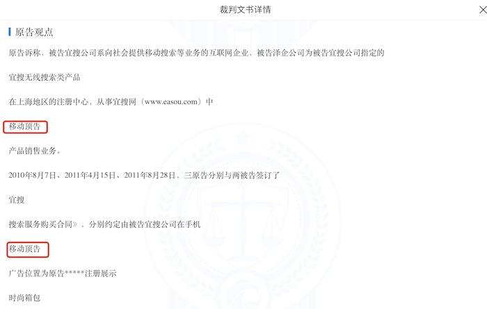据天眼查披露,公司曾经存在多起网络服务合同纠纷,其中两起合同纠纷案中找到了有关宜搜“移动顶告”业务的相关信息。