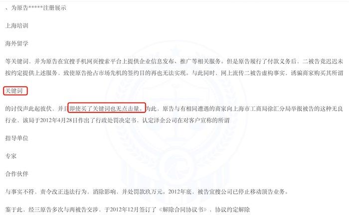 根据案件原告观点,宜搜科技宣称自己是全球最大的中文收集搜索引擎,是即将上市的公司,购买其公司的“关键词”将有高价值回报等,但宜搜科技却在原告购买了其“移动顶告”关键词后迟迟未按照约定提供相关服务。