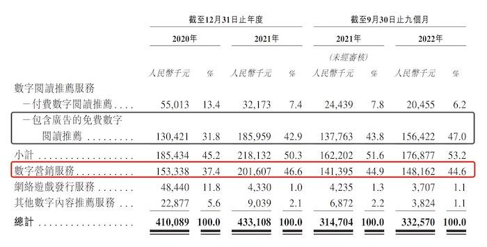数字营销服务 产生的收益分别为153.3百万元、201.6百万元、141.4百万元及148.2百万元,分别占总收益约37.4%、46.5%、44.9%及44.6%。为其第二大收入来源。