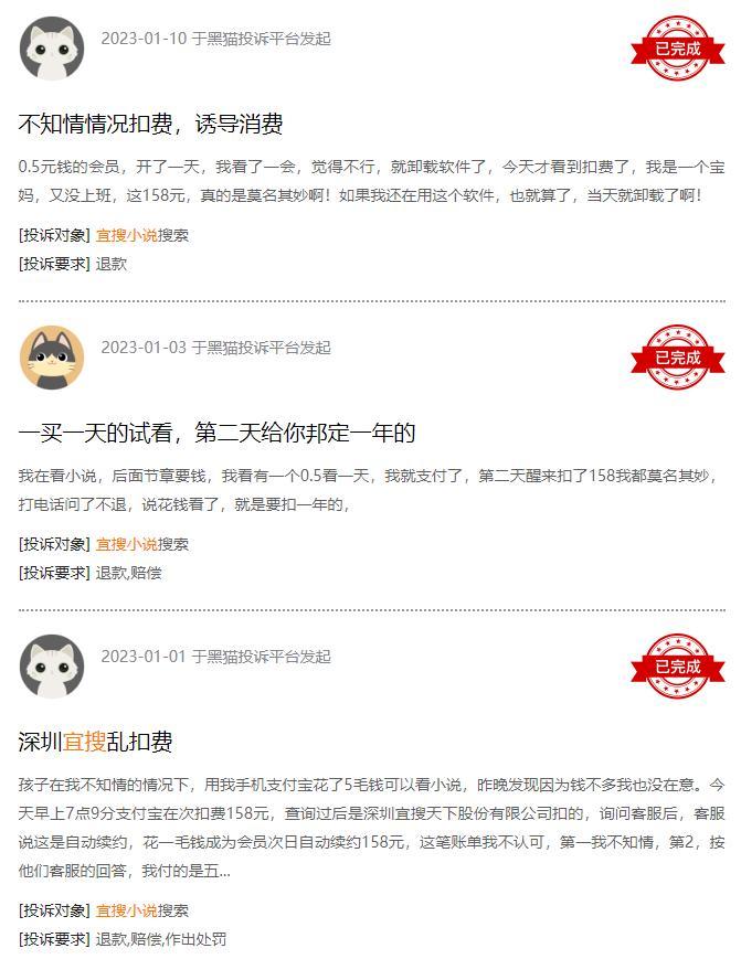 在黑猫投诉上,也有不少消费者反映宜搜小说存在“套路扣费”“诱导消费”的情况,称在花费0.5元试用一天后,次日平台直接扣掉158元的年费。