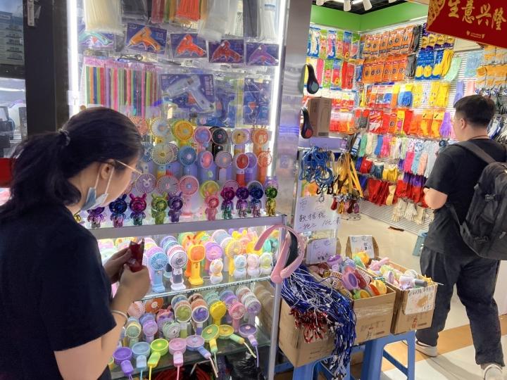 在一区的一家日用百货店,我们的美女同事一眼就看中了一款可喷雾补水的小风扇,看上去像一只小小的化妆笔,很方便放入小包里,粉色的外形也很讨喜。一问价格,同事直接瞪大了眼睛,简直太便宜了。但是,店家要200个起批,总价超出了我们预算,只能放弃。