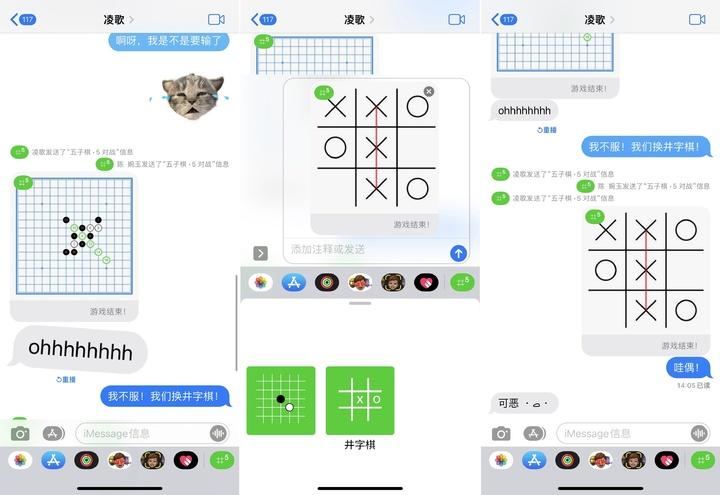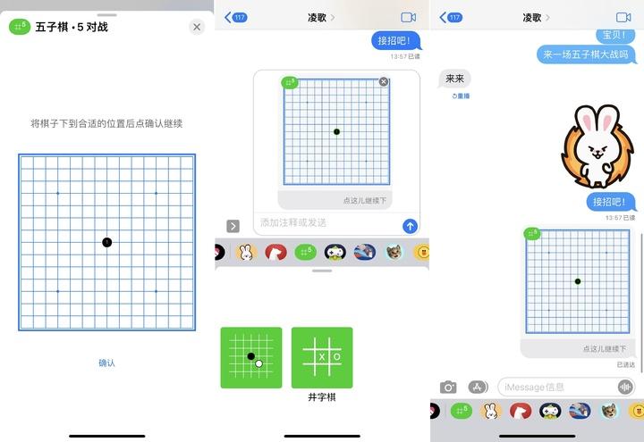 在 iMessage 界面内点开五子棋应用,可以看到它内置了两款最基础的棋盘游戏:五子棋和井字棋。以五子棋为例,将棋子放到合适的位置后点击确认,再点发送,游戏就开始了。