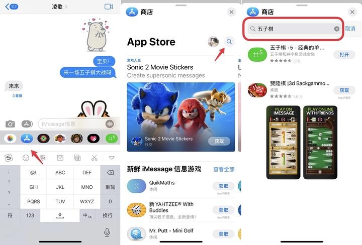 操作很简单,打开和某位好友的 iMessage 对话框,再点击下面的 App Store 图标,搜索「五子棋」并安装即可。