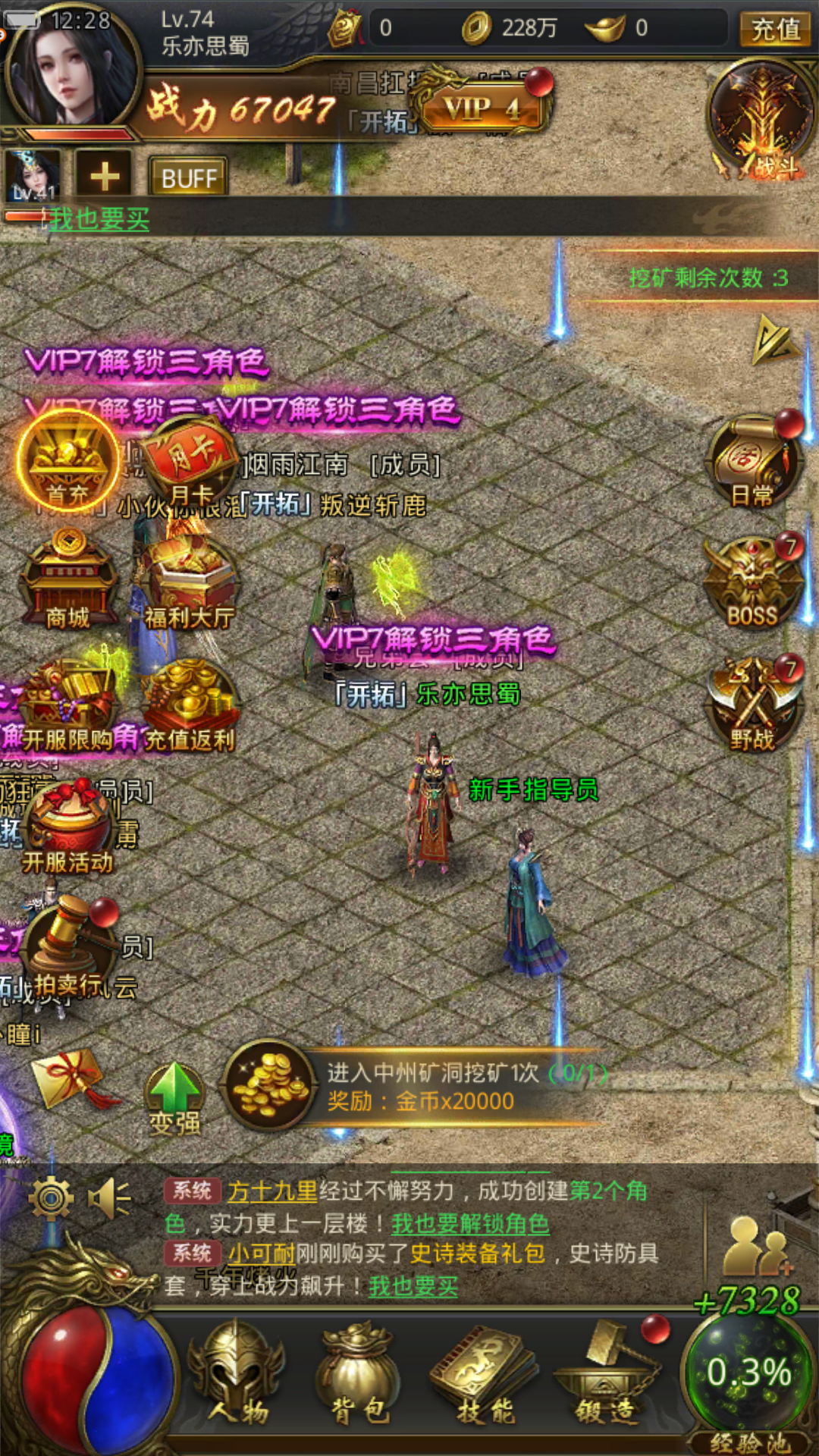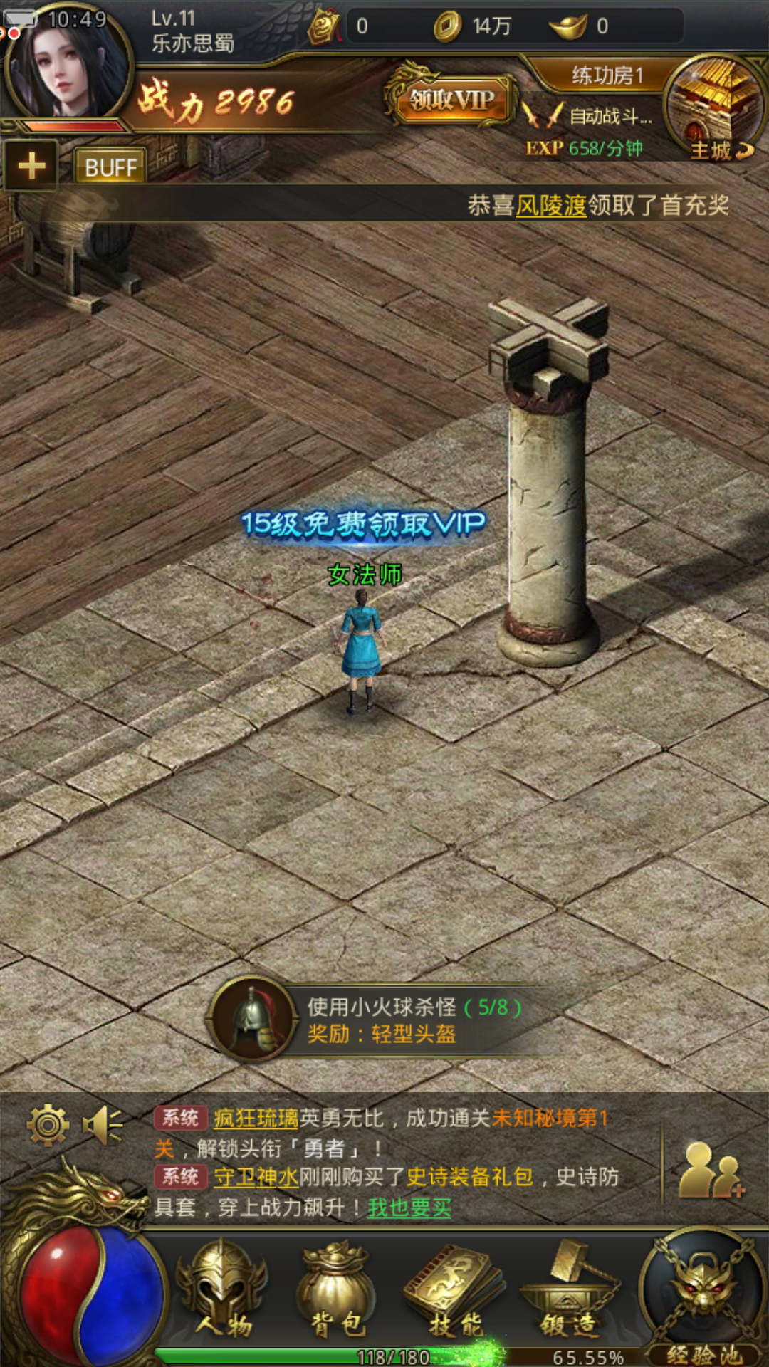 游戏设置了VIP系统,VIP等级越高,开放的特权越多。不过VIP可以通过完成任务免费领取,任务包含提升等级、升级技能、杀boss打装备、野战等等!