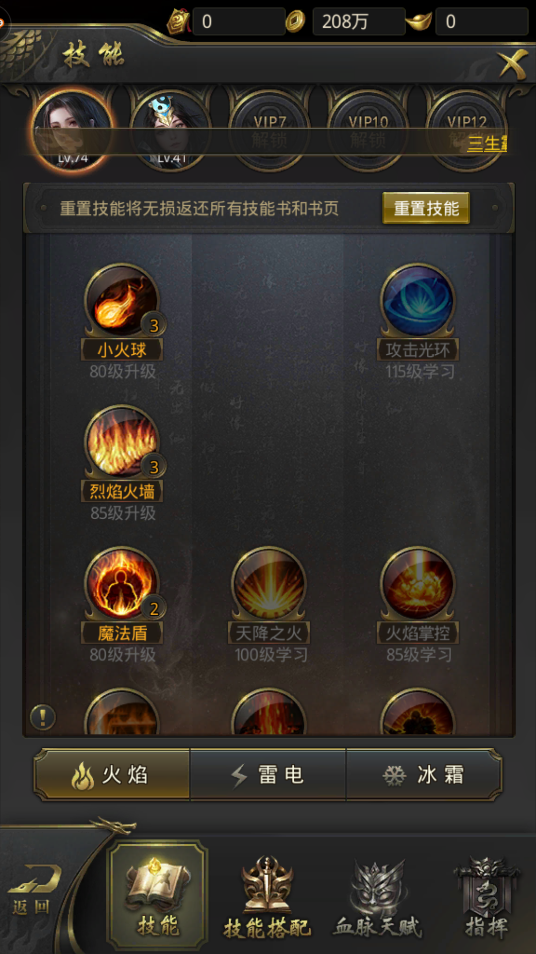 游戏中的多角色系统需要通过升级VIP解锁,总共可以额外解锁4个角色,分别在VIP4、VIP7、VIP10和VIP12解锁,每个新角色可以从三个职业中任选其一,每个角色有三系技能可选,只能选其中一系。