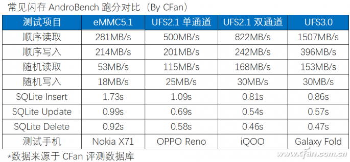 在手机领域,虽然SoC越来越强,内存和存储空间越来越大,摄像头都能拍月亮了,但就存储性能而言,却始终是其综合表现的最大短板。目前手机圈流行的闪存主要以eMMC5.1、UFS2.1单通道、UFS2.1双通道和UFS3.0为主,我们可以通过AndroBench对其性能进行量化对比。