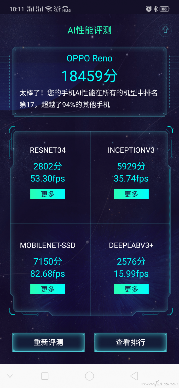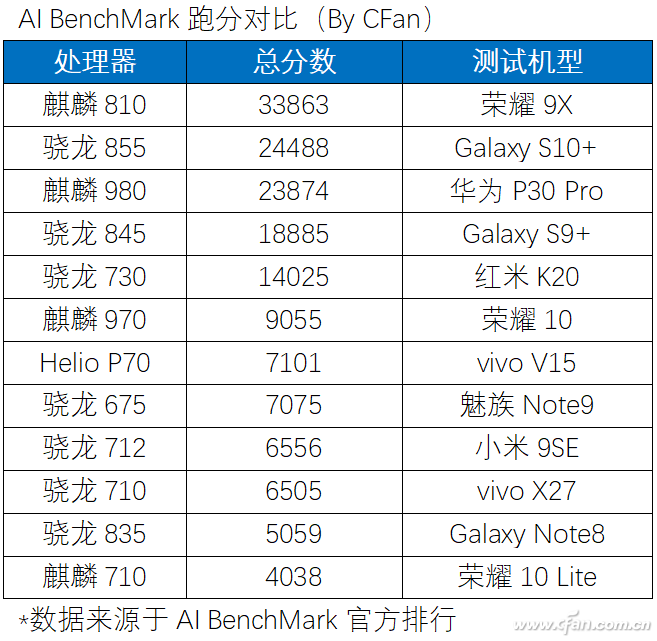 和AIMark相比,安兔兔AI评测更加注重AI在实际应用中的效率,它的评测分别针对图片分类以及对象识别。其中图像识别分类是基于Inception v3神经网络进行,测试200张图片的类别,而对象识别是基于Mobilenet ssd神经网络进行,测试数据为一段600帧的视频。在安兔兔AI评测中,麒麟系的处理器跑分明显偏低,而安兔兔官方暂时还未发布该APP的跑分排行,所以笔者只能从CFan评测过的手机中加以对比。