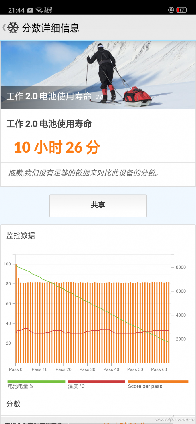 PCMark同时还提供了续航测试功能,限制好手机屏幕亮度,将手机电池充到80%以上就能运行,该APP会反复运行工作2.0中的测试项目直至手机电量降低到20%,根据电消耗量和实际运行的时间,推算出这款手机的理论续航成绩(最好晚上睡觉前测试,早上睡醒正好查看成绩)。