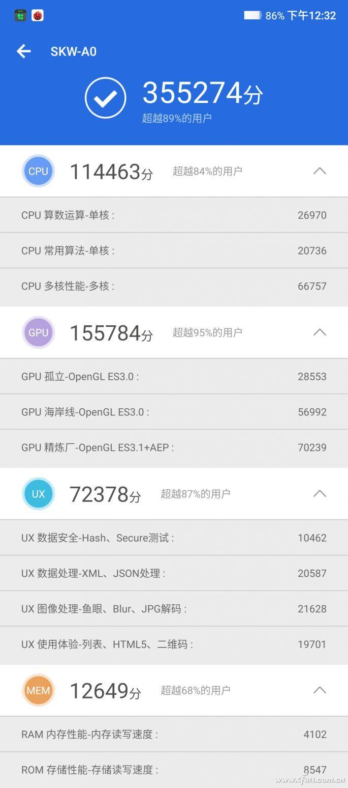 安兔兔评测的成绩由五部分组成,分别是总成绩、CPU、GPU、UX和MEM。其中,总成绩就是我们拿来和其他手机比对的数据,自然是越高越好。CPU和GPU分别考察的是处理器的运算和3D游戏性能,MEM体现内存和闪存性能,而UX则是用户体验测试。UX测试包含数据安全,数据处理,策略游戏,图像处理、界面延迟测试、网页渲染测试和二维码扫描测试等内容,系统优化层面的权重较高,所以也最容易成为“注水”拔高总成绩的对象。