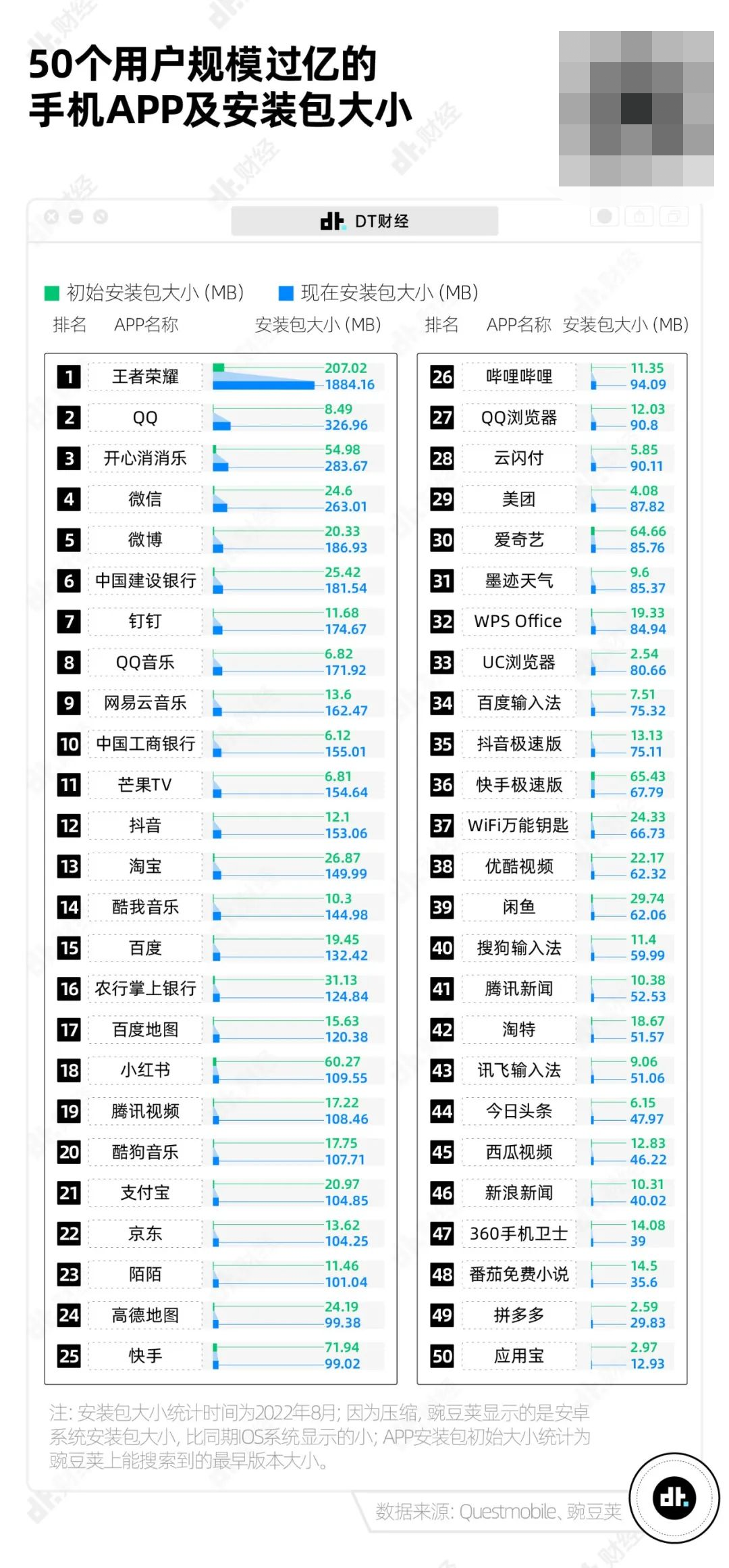 50款常用手机APP中,谁占用空间最大?谁变化最大?