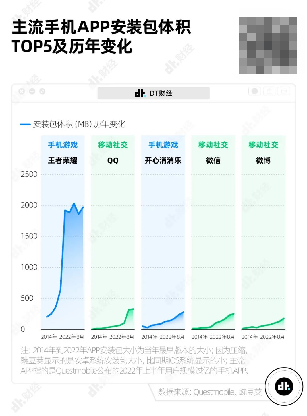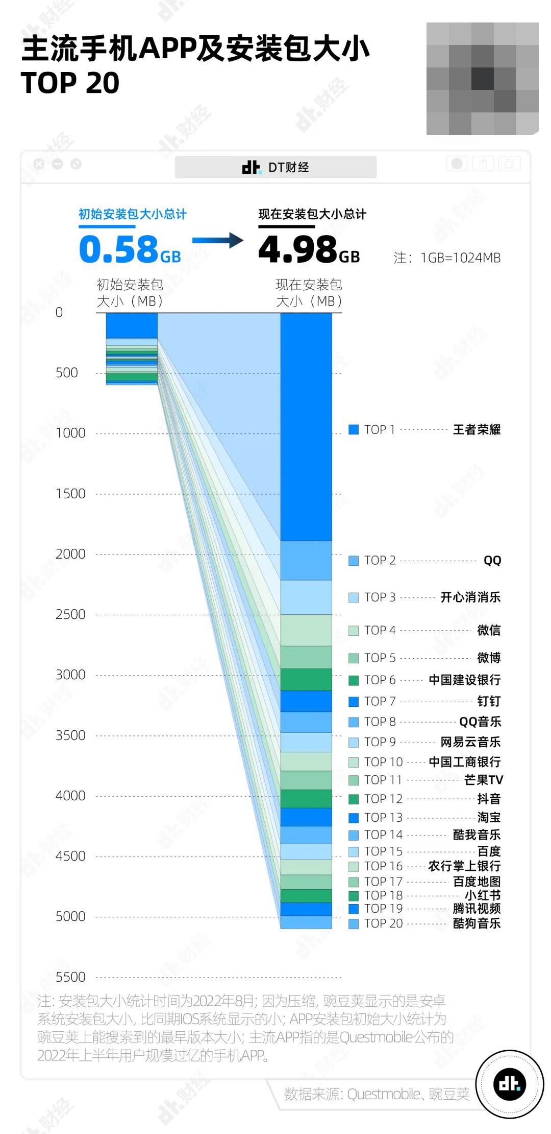 如果只看排名前20的APP,它们的安装包体积和从0.58GB变成了4.98GB,大概是原来的8倍。