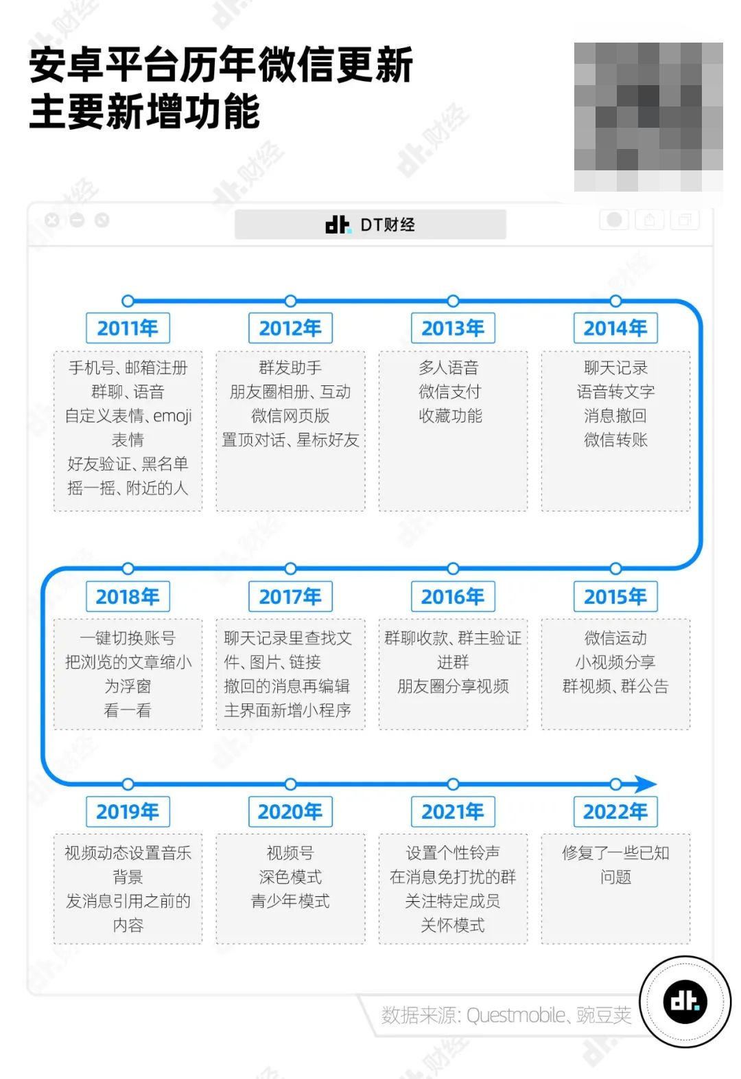 可以看出,在2011年到2015年,微信主要开发和完善的功都围绕社交,最核心的就是聊天功能:微信群、表情包、语音、摇一摇等。