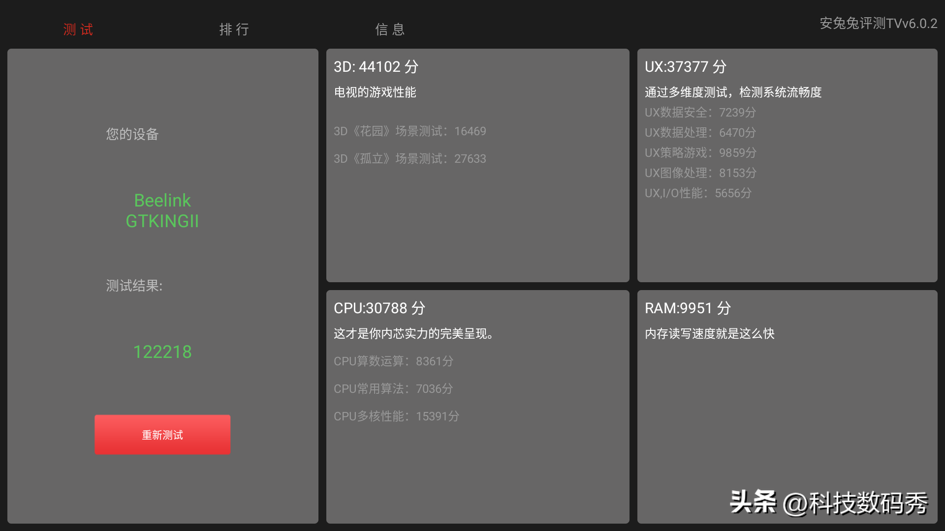 在安兔兔测试当中,零刻GT-King Ⅱ得分为122218,12万的跑分相比乐视MAX4-70、小米电视3等等,那就是碾压机的性能。