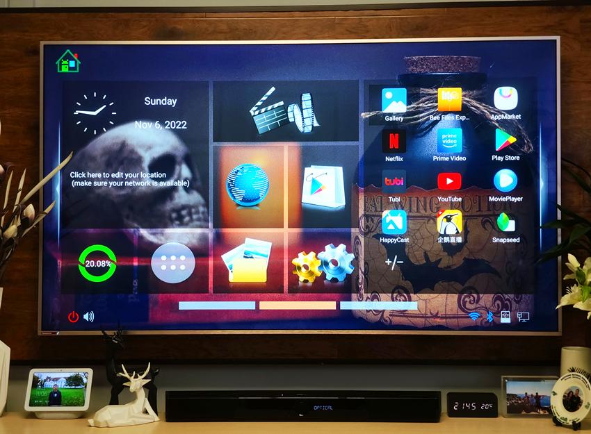 设置Beelink GT-King II与设置其它流媒体播放器一样简单。通过HDMI将它连接到电视机(或投影仪)上,插上电源适配器就可以了。开机后,一个骷髅会出现在电视屏幕中间,它的眼睛闪烁着不同的颜色。几秒钟后就能进入到播放器的主界面。和之前的产品不同,GT-king II搭配的是1个蓝牙的遥控器,支持飞鼠功能。相比2.4G的遥控器,它更不容易受到家里其它产品电磁波的干扰。