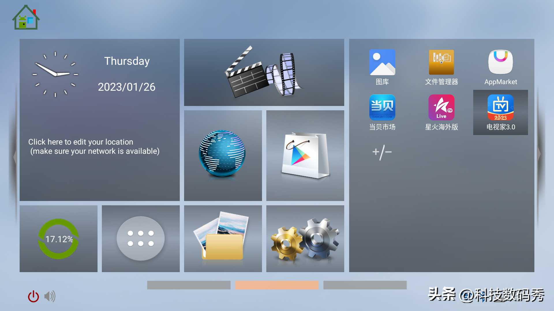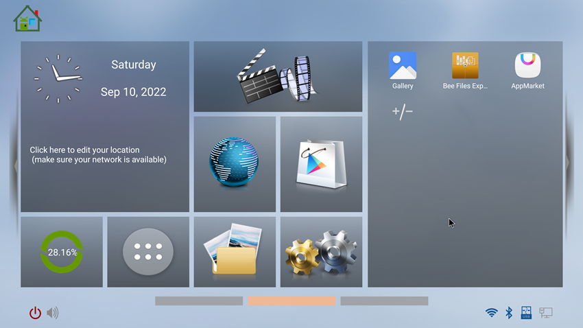 GT-King II出厂运行Android 11操作系统,但用户界面仍旧是是Beelink自行定制的播放器UI,与之前的产品在交互逻辑上没有差别。用户可以在UI首页的右边区域添加最常用的App。控制条被默认隐藏,用户可以通过鼠标从屏幕底部向上拖动将其拉出。GT-King II没有预装很多的app。除了GMS相关服务套件之外,只有Beelink自家的文件管理器、应用市场、媒体中心、电影播放器和音乐播放器。