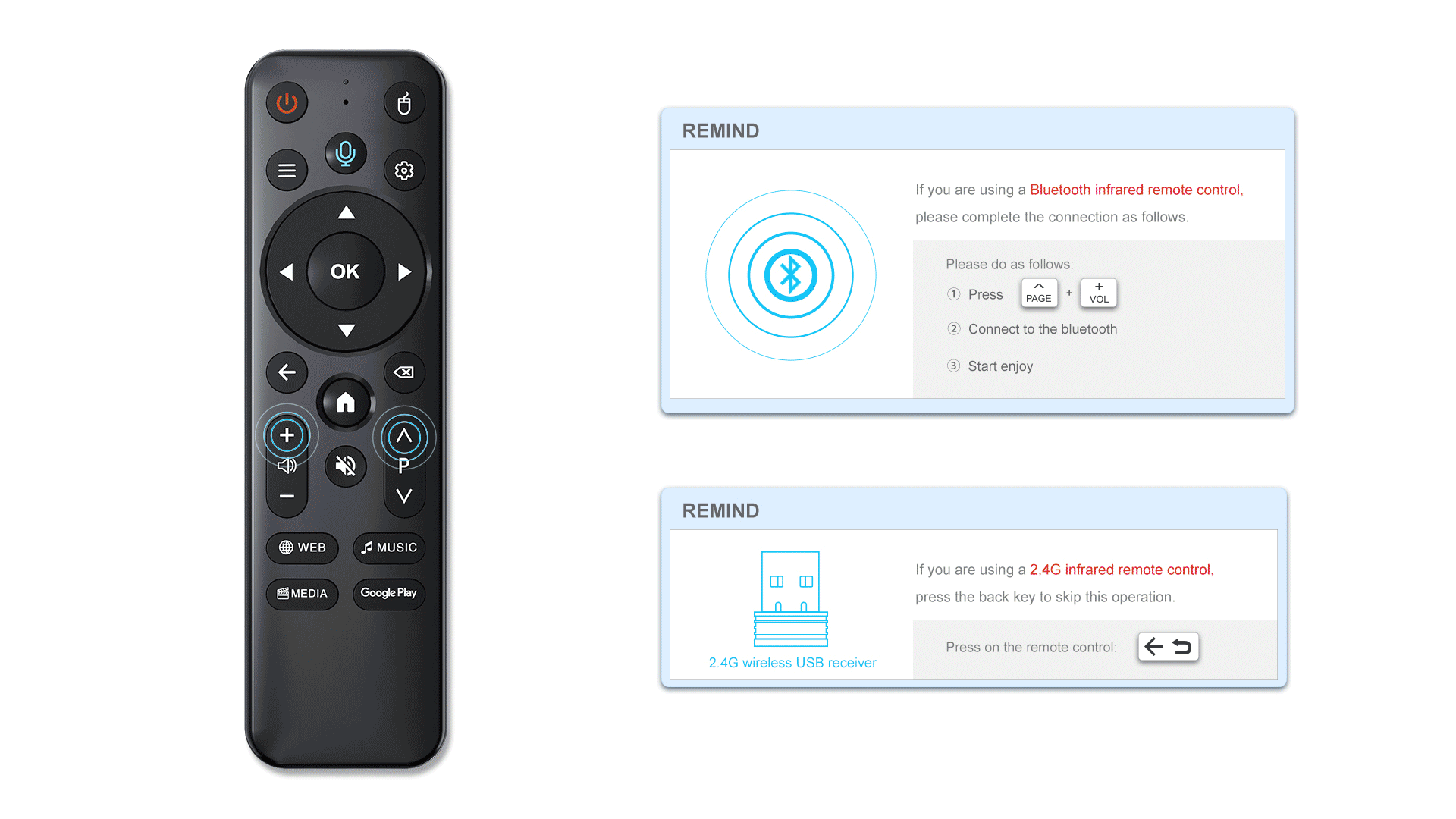 首次开机,会提示需要和你的遥控器进行配对,这里有两种遥控,一种是蓝牙,一种是红外,例如我手上的是蓝牙遥控器,按照提示按下音量和翻页的两个向上按键,同时按下,零刻Beelink GT-King Ⅱ就会自动识别到遥控器蓝牙设备并进行匹配。