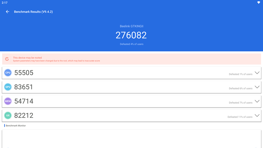 零刻Beelink GT-King Ⅱ的综合运算跑分为5659,虽然跟旗舰手机的处理器没办法相比,但基本上和高通骁龙660差不太多,这个性能在网络播放器圈子里,目前可以说是JDH/HZ的天花板了。
