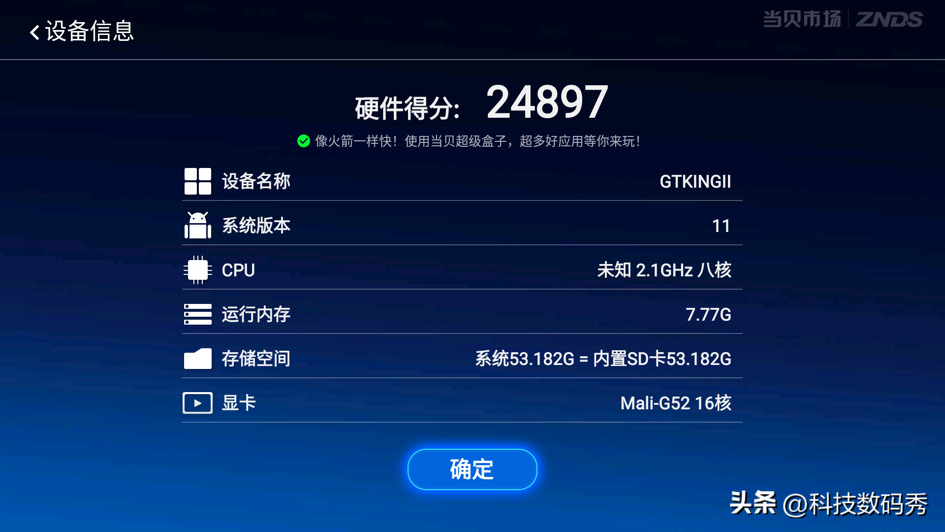 为了后续安装影视剧软件方便,直接下载了一个当贝市场,里面还有一个设备信息查看,硬件得分显示24897,相当离谱,它甚至都没有任何跑分识别,直接就出来一个分数,不具备任何参考价值。
