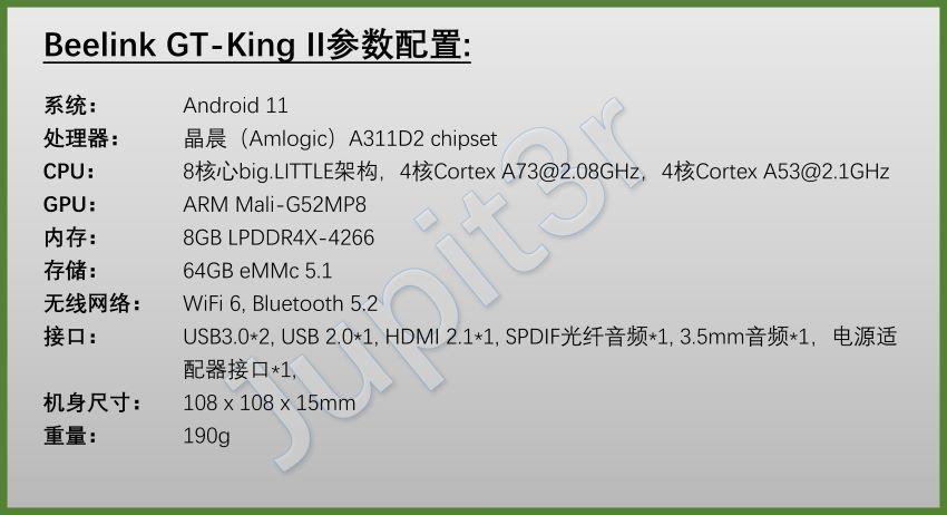 而就在今年,零刻Beelink终于推出了新的方案,那就是基于晶辰A311D2处理器的Beelink GT-King II,相比上一代A311D,由6核6线程升级到了8核8线程,四个Cortex-A73,内核,四个Cortex-A53内核,以及一个很强大的ARM Mali-G52 MP8 GPU显卡,支持4K UI渲染,4K视频编码。