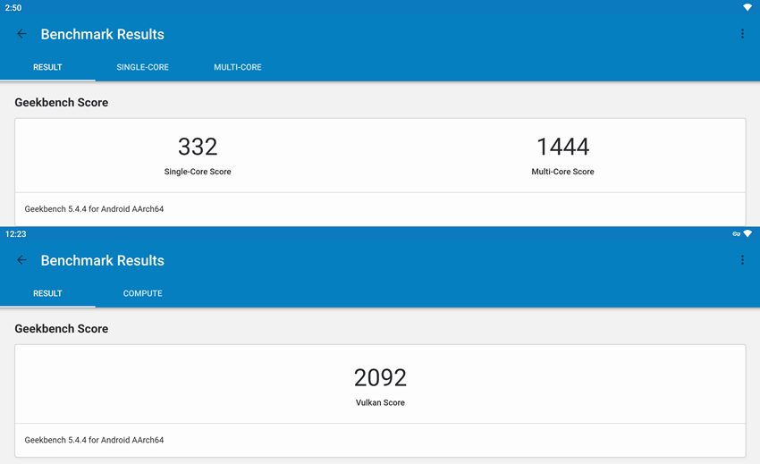 Geekbench 5.4.4,CPU单核得分332,多核1444,Vulkan得分2092,在网络播放器中同样是第一梯队的水准。