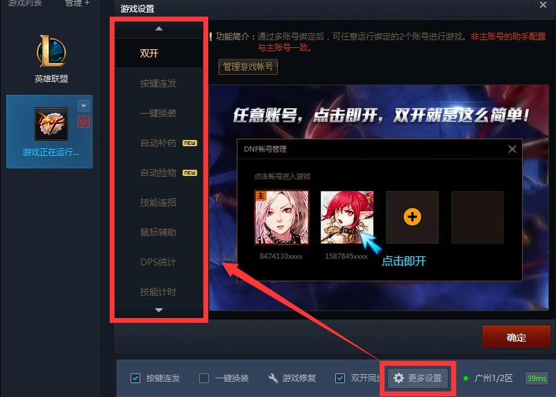 除了常用的按键连发、一键换装和双开游戏,我们点击更多设置后可以发现还有很多隐藏的功能。