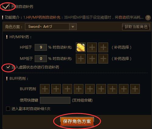 相信很多玩家都试过忘记吃药而被小怪打死的经历,尤其是在打深渊的时候,很多玩家打完深渊后就返回城镇继续进行下一把深渊,偶尔忘记吃药还没上好buff就被小怪秒了。我们可以通过自动补药功能来缓解这种尴尬,设置HP值低于百分之多少的时候自动吃药,记得打上虚弱状态也进行自动补药,设置好后保存角色方案。