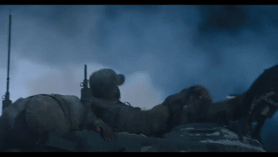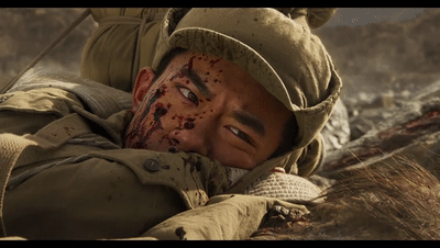 乱石滩,战友张小山被美军战斗机扫射,血肉横飞地惨死在他面前。初步经历战争残酷洗礼的他,眼神开始转变,有恐惧也有愤怒。