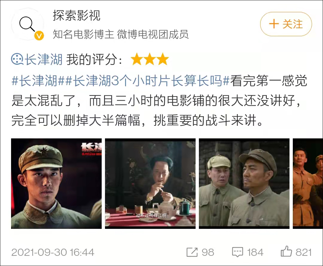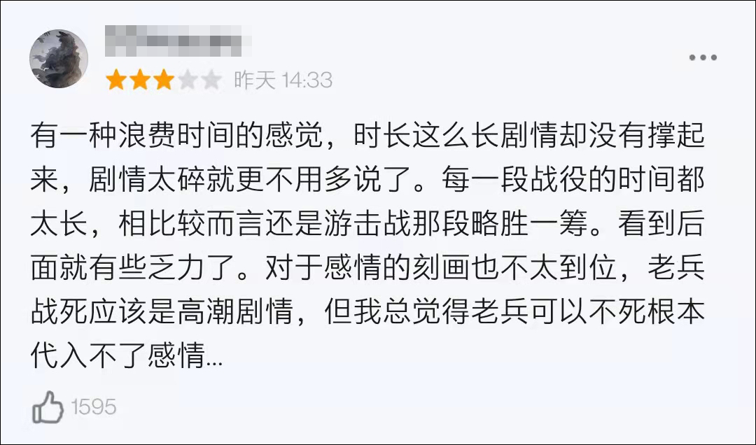 除了3小时的片长过长外,一些观众还认为《长津湖》的剧情发散,煽情刻意,没有跳出主旋律片的窠臼。