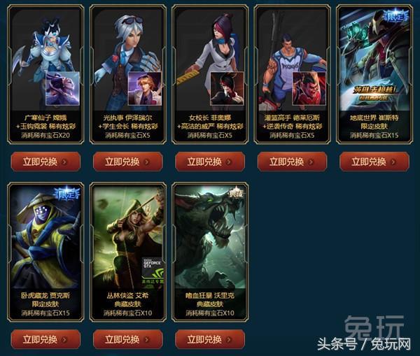 到8 月4号23:59分 为止,海克斯稀有宝石产出概率在原基础上提高50% (即由20%提升至30%),兑换3款海克斯限定皮肤(安妮、薇恩、德莱厄斯)所需宝石减半 ,还可以用一定数量的稀有宝石兑换八款稀有的限定皮肤 。