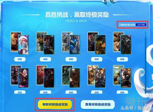 单人完成2局指定游戏类型可以解锁一款7天体验英雄&皮肤(此任务可反复完成,组队仅需1局即可领取,活动最后3日可获得3倍奖励)。已解锁的数量可以在右上角处查看。解锁超过10款英雄/皮肤后,可点击黄色按钮 可领取包含诸多传说皮肤在内的终极奖励 。