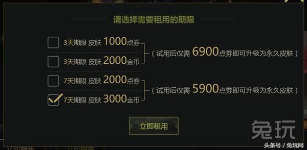 在弹出的页面中可以看到4种租用方式。小编建议大家选择最后一种方式——花费3000金币租用7天 。选择这种方式试用后仅需5900点券即可升级为永久皮肤 ,可谓是前所未有的超低价。