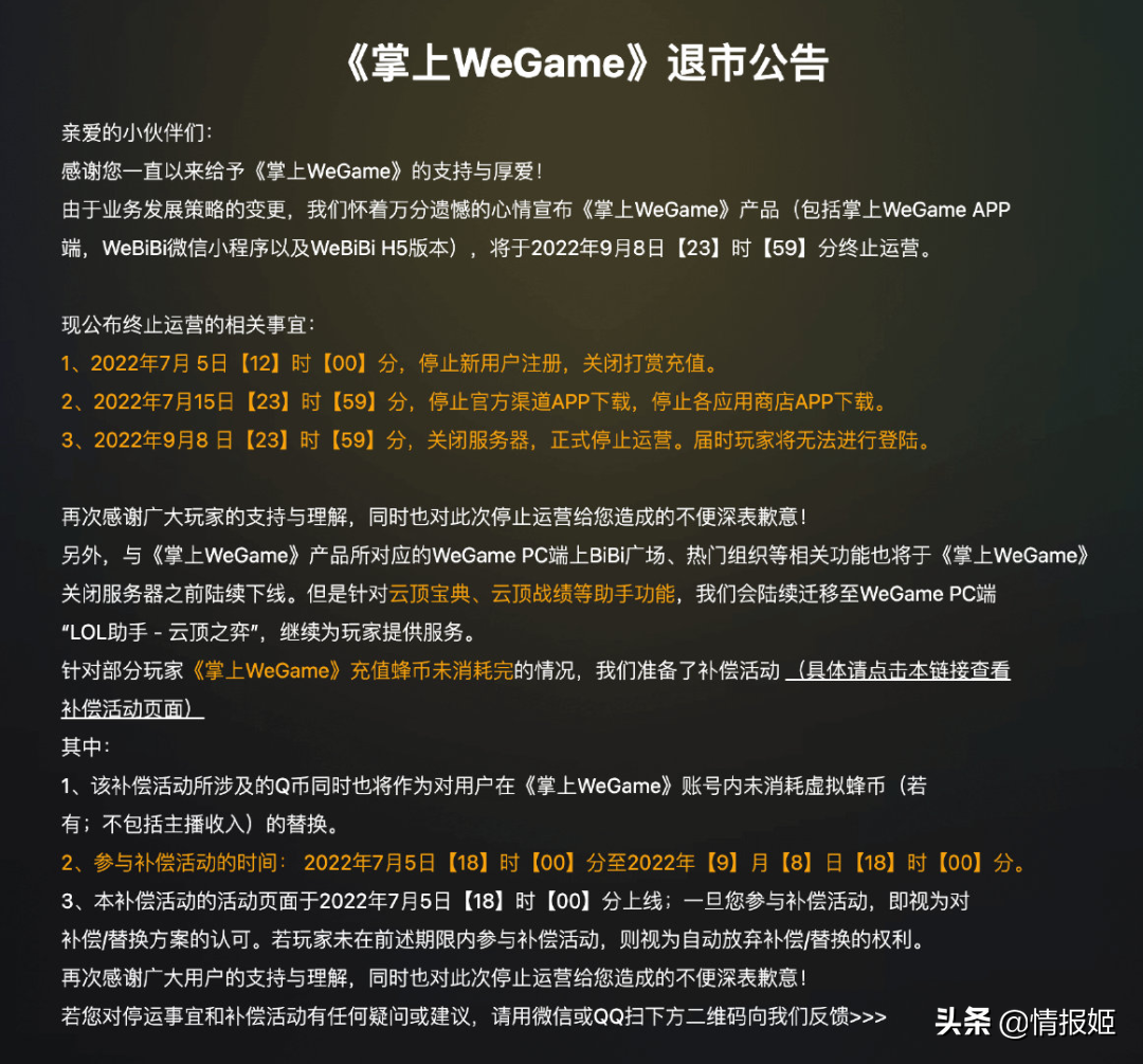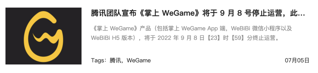 今天下午,《掌上WeGame》团队发布了一条退市公告,宣布连同APP、微信小程序与H5在内的《掌上WeGame》产品将在9月8日终止运营。
