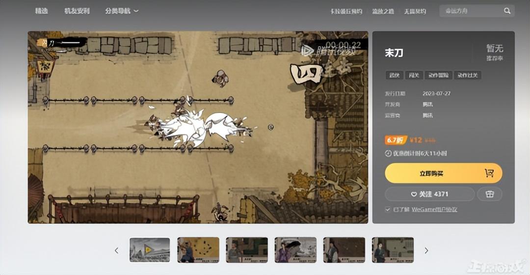 腾讯旗下光子工作室自主研发的武侠闯关单机游戏《末刀》于2023年7月27日正式定档发布,游戏采用一次性买断的付费模式,目前首发价仅需要12元(原价18元)。根据官方介绍,该作以跳脱以往武侠题材游戏的数值和武功限制,以“一刀定胜负”作为游戏核心。