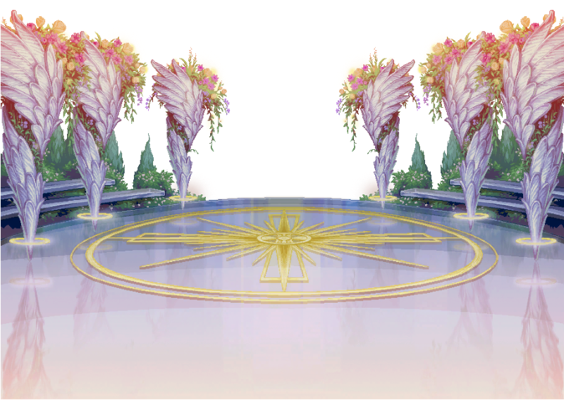 这就是三觉中的背景舞台,各位可能没想到吧,是这个样子,在此佩服一下韩服的设计人员,天堂风格展现的淋漓尽致,中央那个大大的圣光标识,两边的悬浮花卉,自下而上羽毛风环绕,估计这个在现实中,谁要是能做出来,标价好几千都有买;花卉两边的是长凳吗?远处也能看出想松树一样植物,和一些花草,很遗憾对植物没有研究,所以叫不出名字。