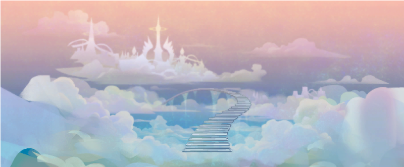 这就是整个三觉中的大背景建筑,果然是一道长长的楼梯(没有护栏安全意识淡薄),远处也能看到另一个天堂风建筑群,两边是彩虹云;