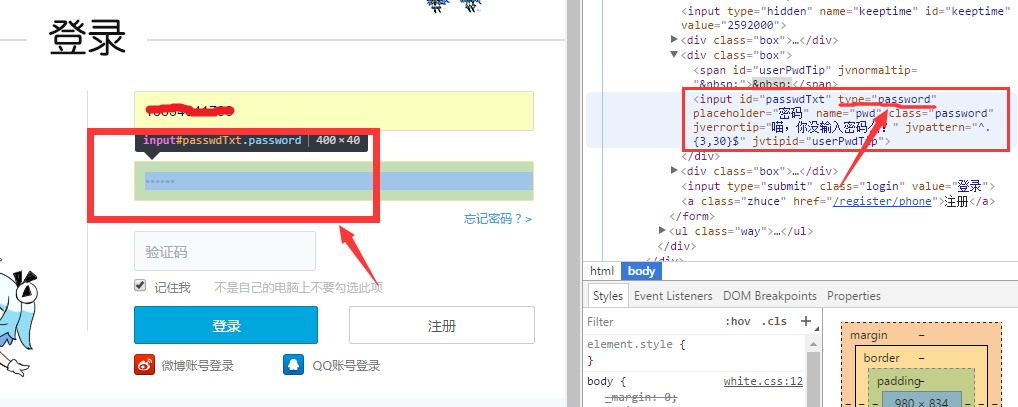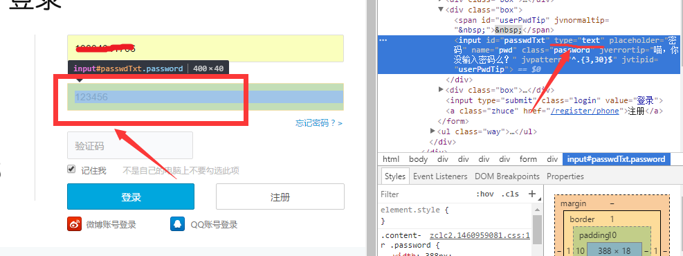 选中密码这个元素并点击,在右侧代码区找到相对应的代码(红框区),找到type值