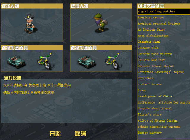 最经典的游戏还是这个警察抓小偷的游戏,游戏开始前你需要选择角色,选警察需要抓到小偷,选小偷就需要躲过警察的追捕,你还可以选择自己的加速载具,有汽车和自行车,这个游戏不同于别的游戏的是,不再是一个一个输字母,而是需要选择一篇文章,然后整句的输入,每输入正确一个字母人物就会移动一步。