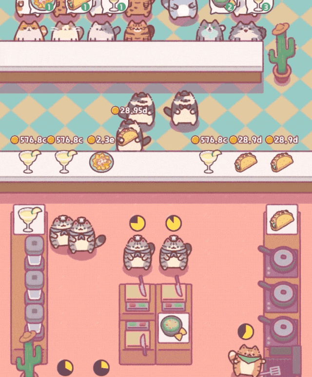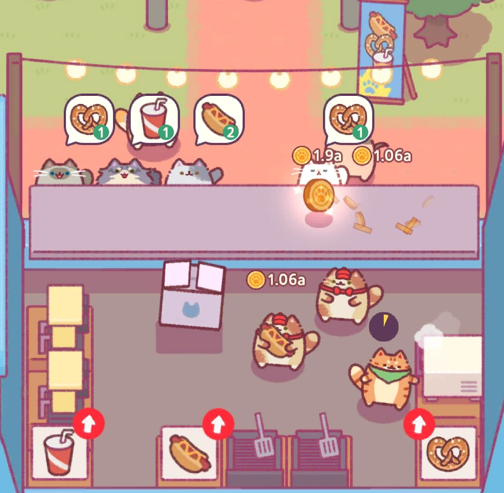 只要不断收集金币,升级这个世界的科技,比如增加一只猫、提升三明治的价格、多卖一款饮料,它们就会自动干活儿,挣的金币数字后缀从a一路追加到e。所以不去点科技、一直放着等收款也是可以的——只要你忍得住再升级一点的诱惑。