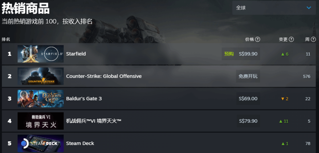 榜单排名前五的游戏 / 产品还包括:《CS GO》、《博德之门 3》、《装甲核心 6》、Steam Deck 游戏机,COD 系列新作《使命召唤 20》则排名榜单第十名。