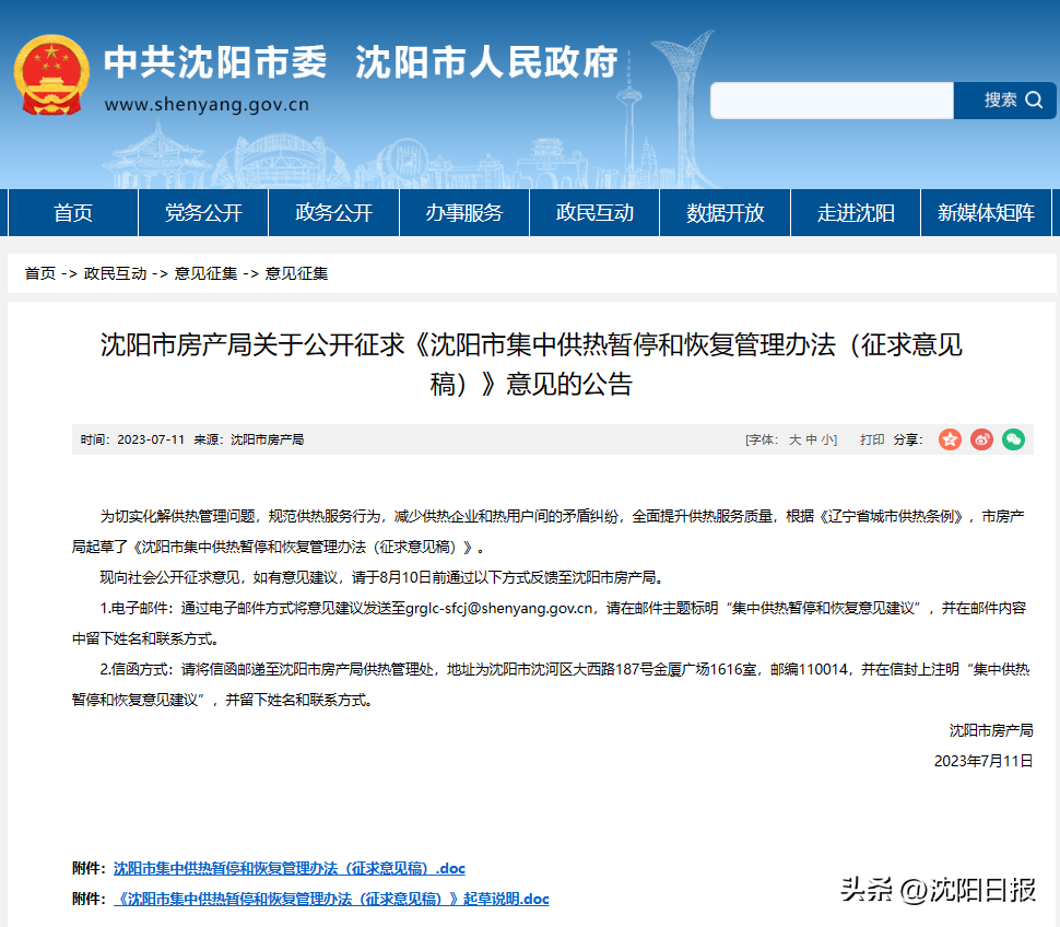 《沈阳市集中供热暂停和恢复管理办法(征求意见稿)》