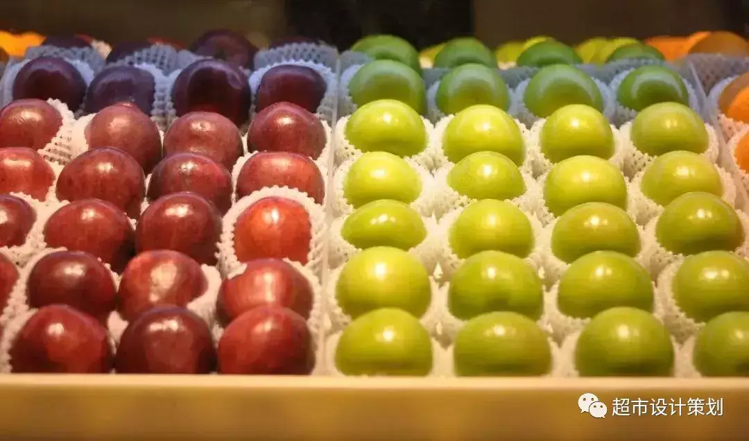每个陈列区域,都应该有自己的主色调。不同分类的水果,也要按照同色系的方法陈列,这样做的目的,是减少突兀感。