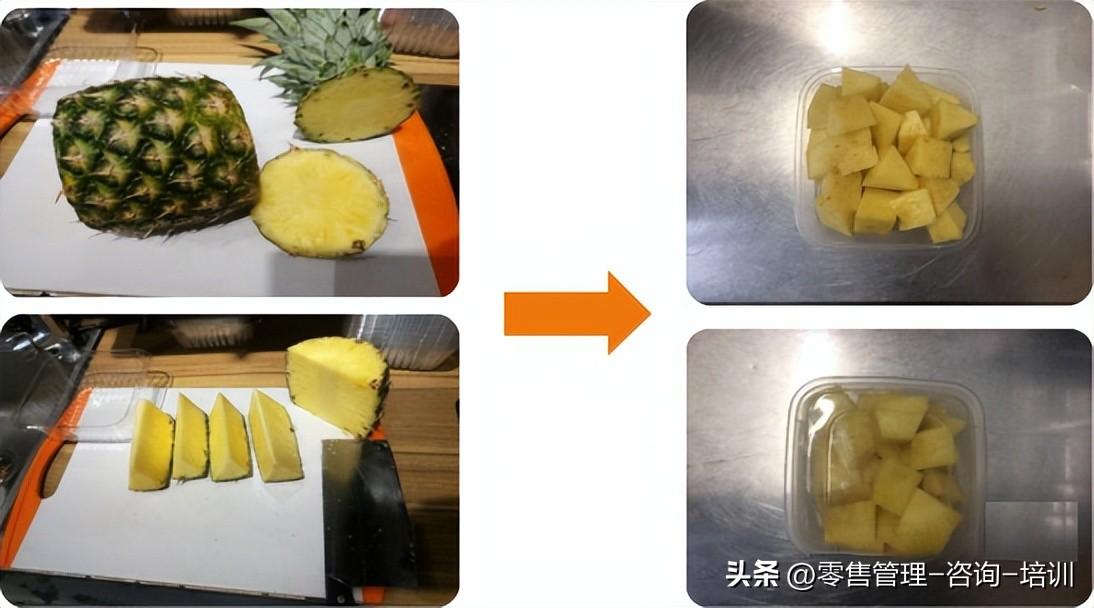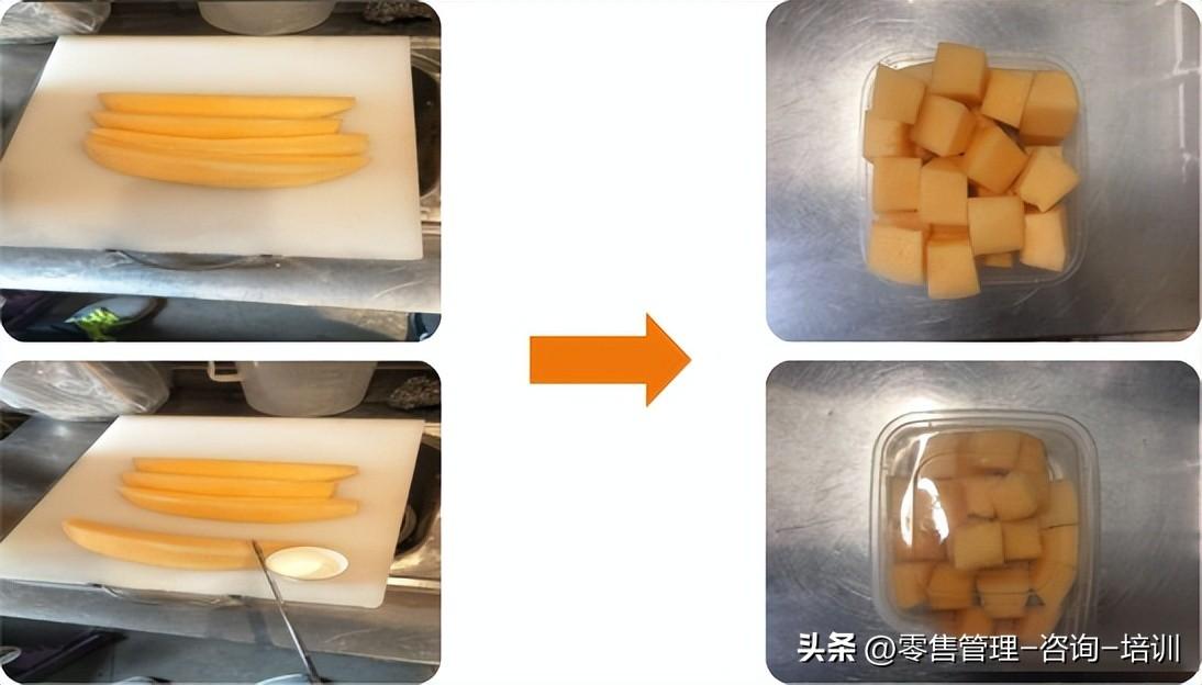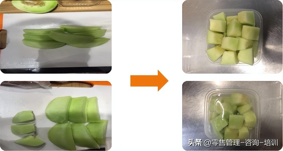 注:现切水果形状以正方形为宜,切块不宜过小。