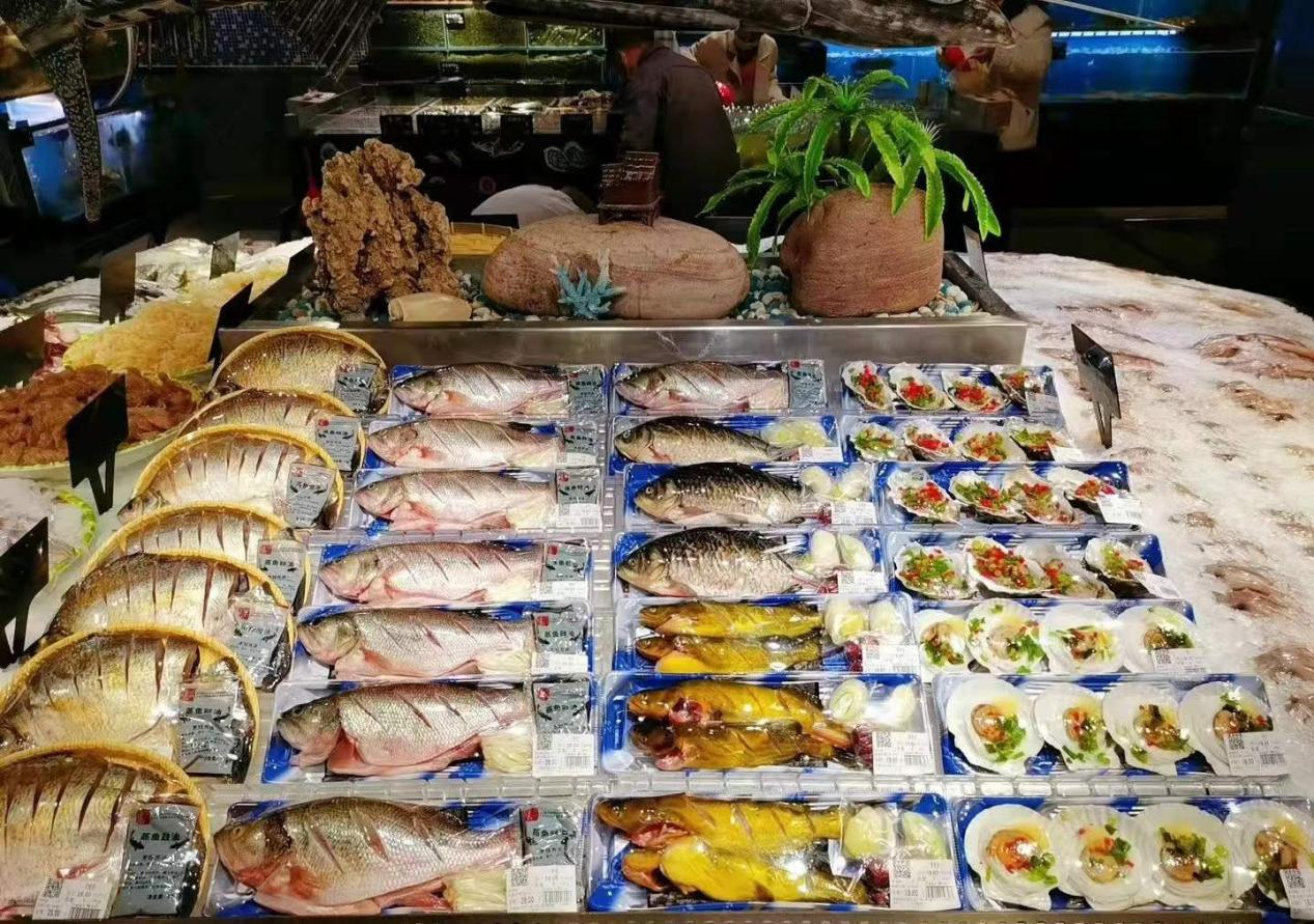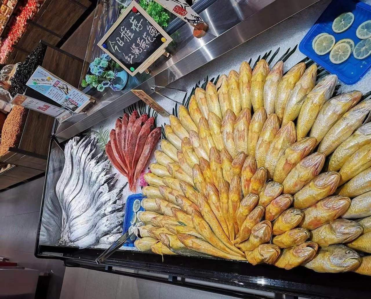 这是早上刚开门的时候,这鱼有这么整齐,鱼头朝向一个方向…… 整理起来肯定特别的麻烦叭,哎,等到晚上下班的时候,它们又是另一副“悲壮”的样子了。永远不要低估超市阿姨摆放物品的能力,超市阿姨在这个职业能体会到专业的美感!只有你想不到没有他们做不到。