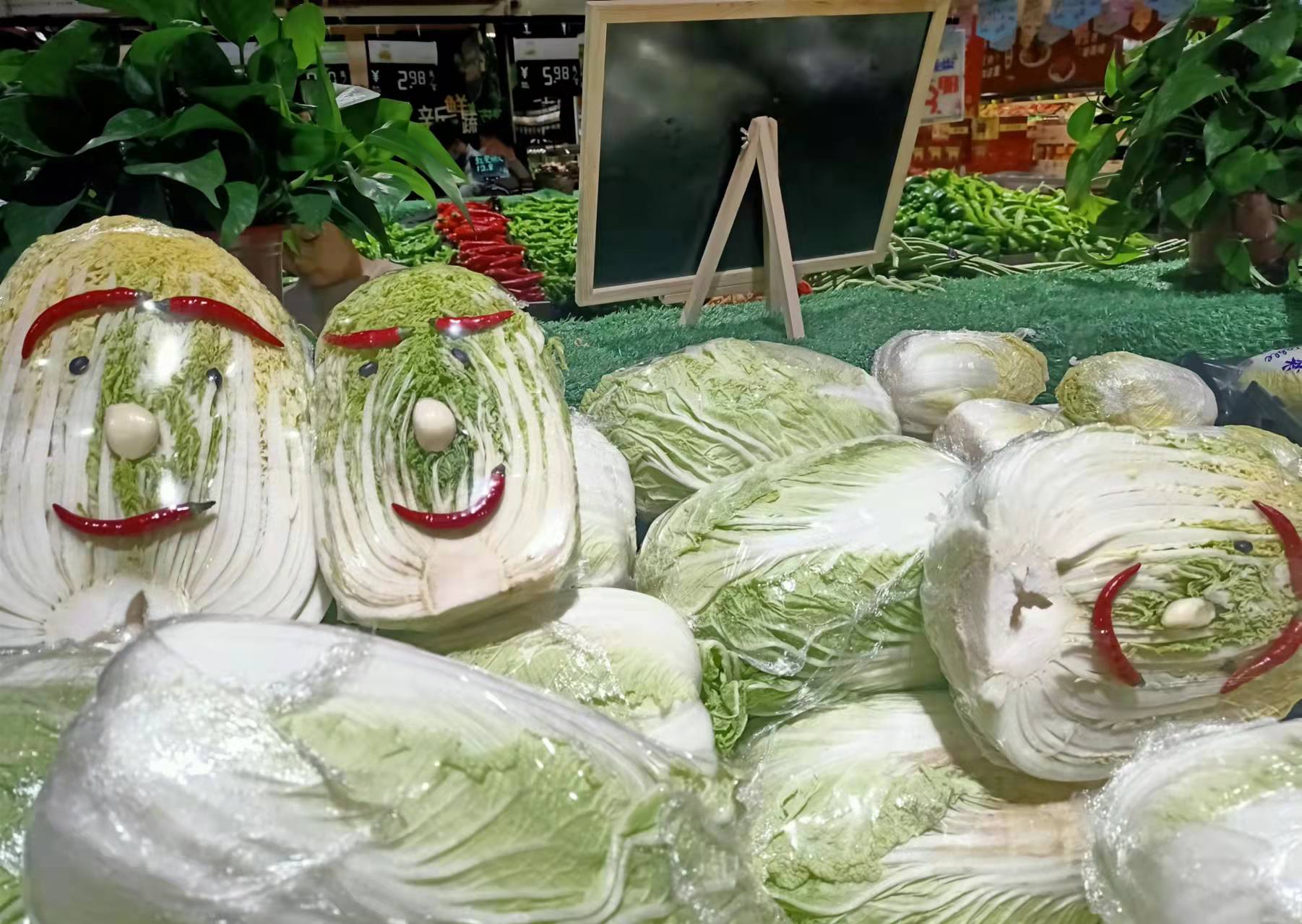 甘蓝菜:切除突出之茎部及外叶,以保险直接包装,体积较大者可用刀对切,标价后置于冷藏柜中销售