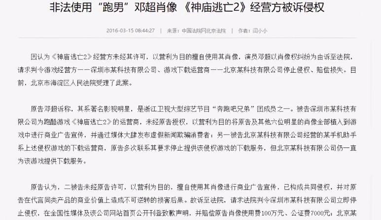 原来,不论是游戏海报与角色,《神庙逃亡2》运营方都是在未获得MC肖像权的情况下,擅自使用并宣传的。2月19日,邓超等艺人以侵权名义将游戏告上法庭,索赔一百万并下架侵权内容,结果不言而喻,自然是运营方败诉,甚至这等骚操作,还登上了民主与法制时报。